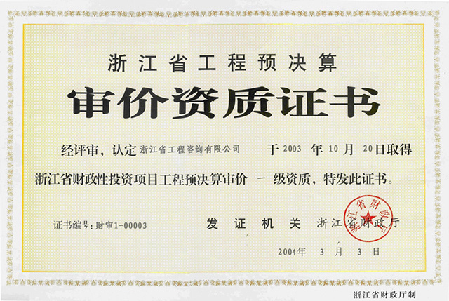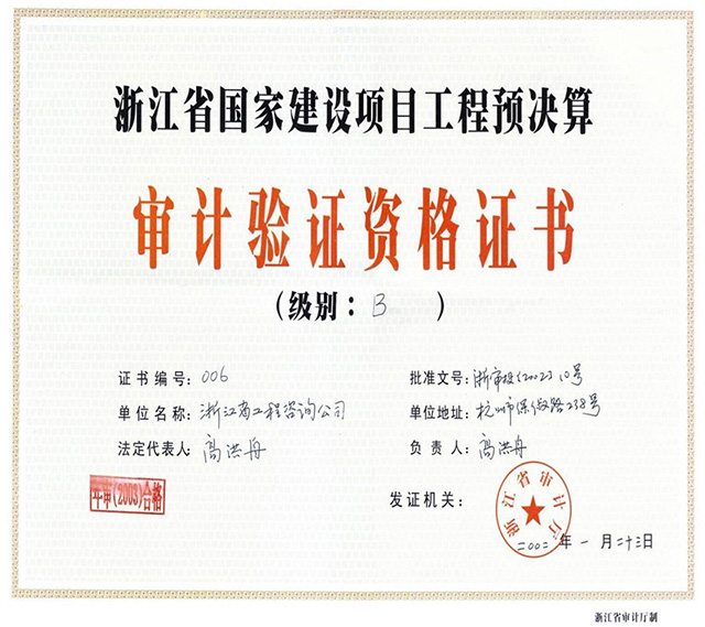 浙江省國(guó)家建設(shè)項(xiàng)目工程預(yù)決算審計(jì)驗(yàn)證資格B級(jí)