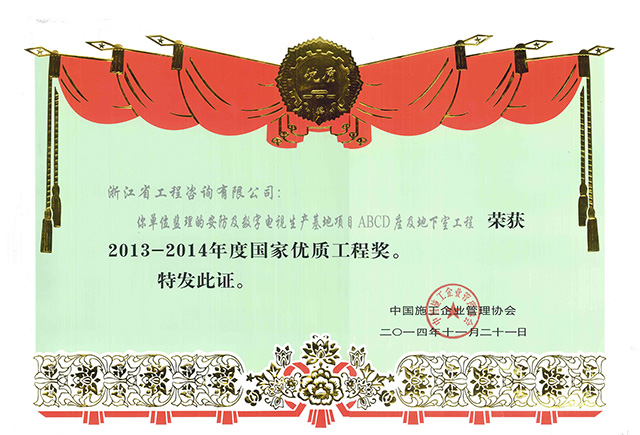 2013-2014年度國家優(yōu)質(zhì)工程獎-安防及數(shù)字電視生產(chǎn)基地項(xiàng)目ABCD座及地下室工程