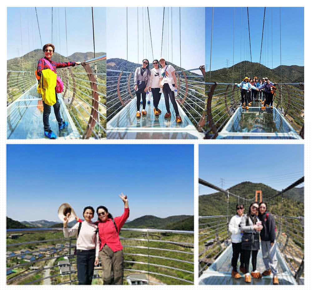 其中最為刺激的要數浙北高空玻璃橋,玻璃橋連接了兩座山,長度達288米。站在清晰透明的玻璃橋上面,腳下就是萬丈深淵??犰诺?D特效,讓你每走一步都“會炸!會裂”!勇敢的“女漢子”們紛紛體驗了一把心跳加快、腎上腺素爆棚的驚險刺激感覺!