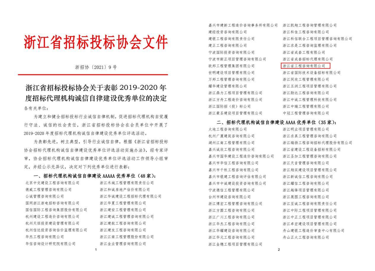近日,根據(jù)《浙江省招標(biāo)投標(biāo)協(xié)會(huì)招標(biāo)代理機(jī)構(gòu)誠(chéng)信自律建設(shè)優(yōu)秀單位評(píng)選活動(dòng)實(shí)施辦法》,經(jīng)專(zhuān)家評(píng)審,協(xié)會(huì)招標(biāo)代理機(jī)構(gòu)誠(chéng)信自律建設(shè)優(yōu)秀單位評(píng)選活動(dòng)工作領(lǐng)導(dǎo)小組審定,我公司被評(píng)為2019-2020年度招標(biāo)代理機(jī)構(gòu)誠(chéng)信自律建設(shè)AAAAA優(yōu)秀單位。公司已連續(xù)多年獲得招標(biāo)代理機(jī)構(gòu)誠(chéng)信自律建設(shè)AAAAA優(yōu)秀單位。
