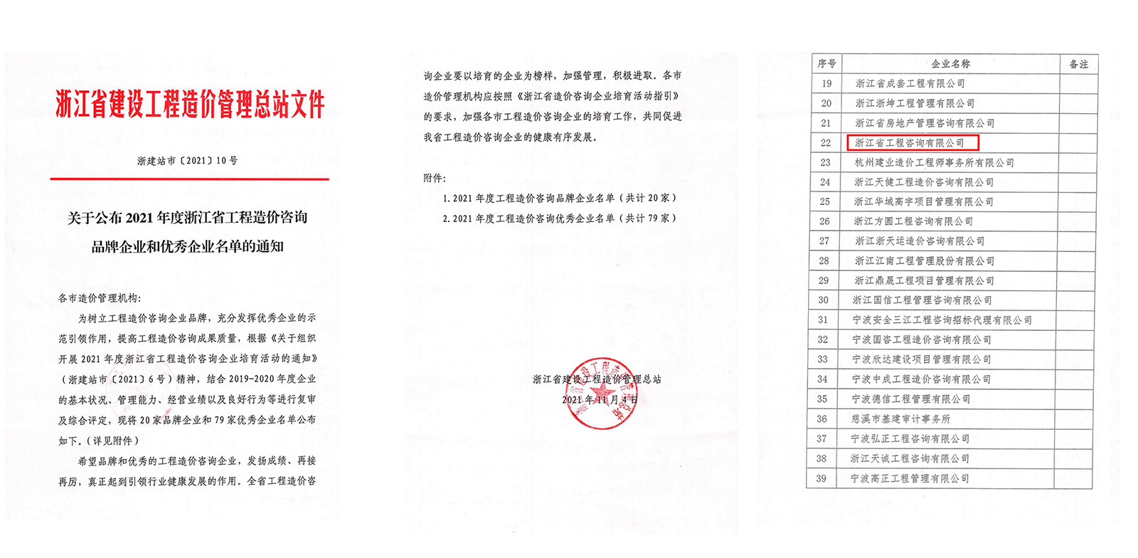 近日,浙江省建設工程造價管理總站根據《關于組織開展2021年度浙江省工程造價咨詢企業培育活動的通知》(浙建站市〔2021〕6號)精神,結合2019-2020年度企業的基本狀況、管理能力、經營業績以及良好行為等進行復審及綜合評定,評選出20家品牌企業和79家優秀企業,我公司憑借優異的表現,再次獲得“浙江省工程造價咨詢優秀企業”榮譽稱號。