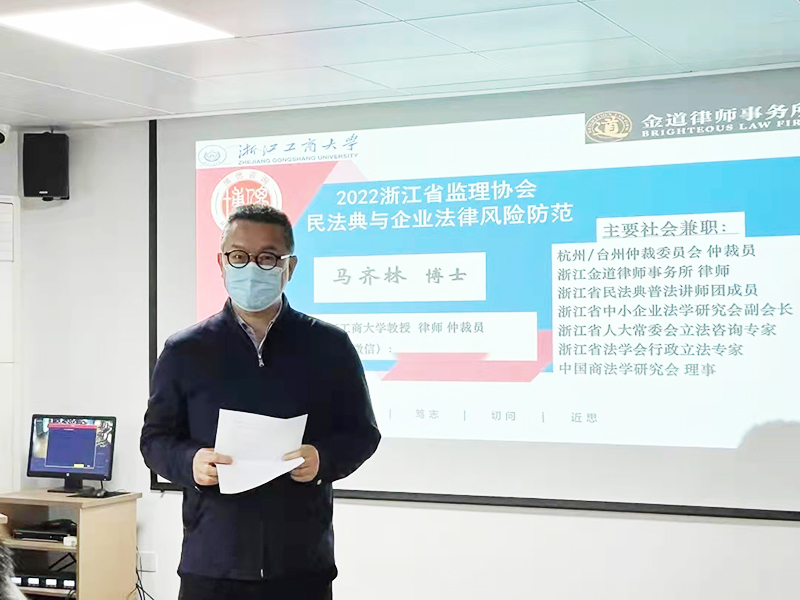 金道所兼職律師、浙江工商大學教授馬齊林主講《民法典與企業風險防范》專題。馬教授解讀《民法典》雖名為“民”,實則“民商合一”,與商業經營存在密不可分的關系,著重分析闡述了構成企業法律風險的基本要素、法人決議瑕疵風險及其責任后果等問題,提出企業建立健全法律風險防御機制的重要性。