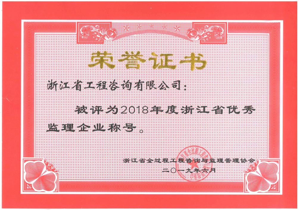 我公司再次被評為浙江省優秀監理企業。第四事業部蔣挺、第六事業部楊寶紅和第九事業部陶建松三位同志被評為浙江省優秀總監理工程師。