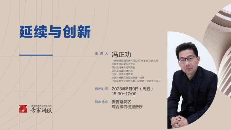本次考察調研以馮正功大師在浙江省院綜合樓報告廳作的題為“延續與創新”的主題講座作為收尾。講座中,馮正功大師闡述了“延續建筑”的概念,即發現、探索與總結建筑所處場地獨特的地域、時間、人文、自然、歷史、記憶等重要特征,基于當代建筑語境與人本多重需求的基礎上,將以上元素延續并創新于建筑設計之中。隨后又分別從延續建筑的空間維度、時間維度、人文維度作了詳細的講解,同時還提出了“延續建筑”的十條實踐路徑,為現場的設計師們開拓了思路。