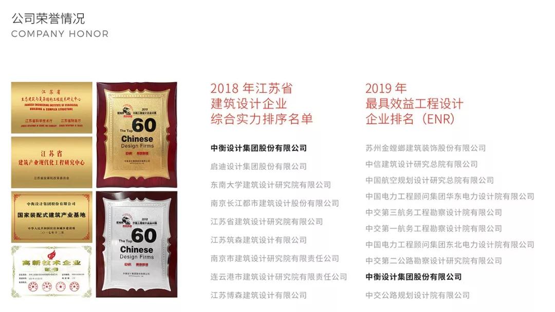 近年來中衡設(shè)計(jì)集團(tuán)綜合實(shí)力不斷增強(qiáng),于2017 年上半年被住建部選定為全國(guó)首批 40 家全過程工程咨詢?cè)圏c(diǎn)企業(yè)之一。目前位列2018江蘇省建筑設(shè)計(jì)企業(yè)綜合實(shí)力第一,連續(xù)兩年入選美國(guó)ENR和中國(guó)《建筑時(shí)報(bào)》“中國(guó)工程設(shè)計(jì)企業(yè)60強(qiáng)”和“最具效益設(shè)計(jì)企業(yè)”榜單。