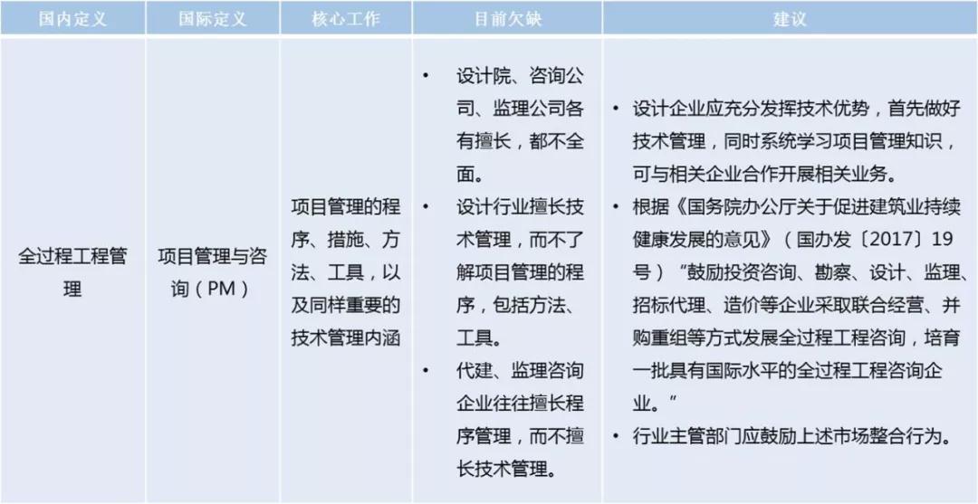 《國(guó)務(wù)院辦公廳關(guān)于促進(jìn)建筑業(yè)持續(xù)健康發(fā)展的意見》(國(guó)辦發(fā)[2017]19號(hào))中指出,在完善工程建設(shè)組織模式中應(yīng):“加快推行工程總承包”、“培育全過程工程咨詢”、“在民用建筑項(xiàng)目中,充分發(fā)揮建筑師的主導(dǎo)作用,鼓勵(lì)提供全過程工程咨詢服務(wù)”;在提高從業(yè)人員素質(zhì)上應(yīng):“加快培養(yǎng)建筑人才。積極培育既有國(guó)際視野又有民族自信的建筑師隊(duì)伍。加快培養(yǎng)熟悉國(guó)際規(guī)則的建筑業(yè)高級(jí)管理人才”。