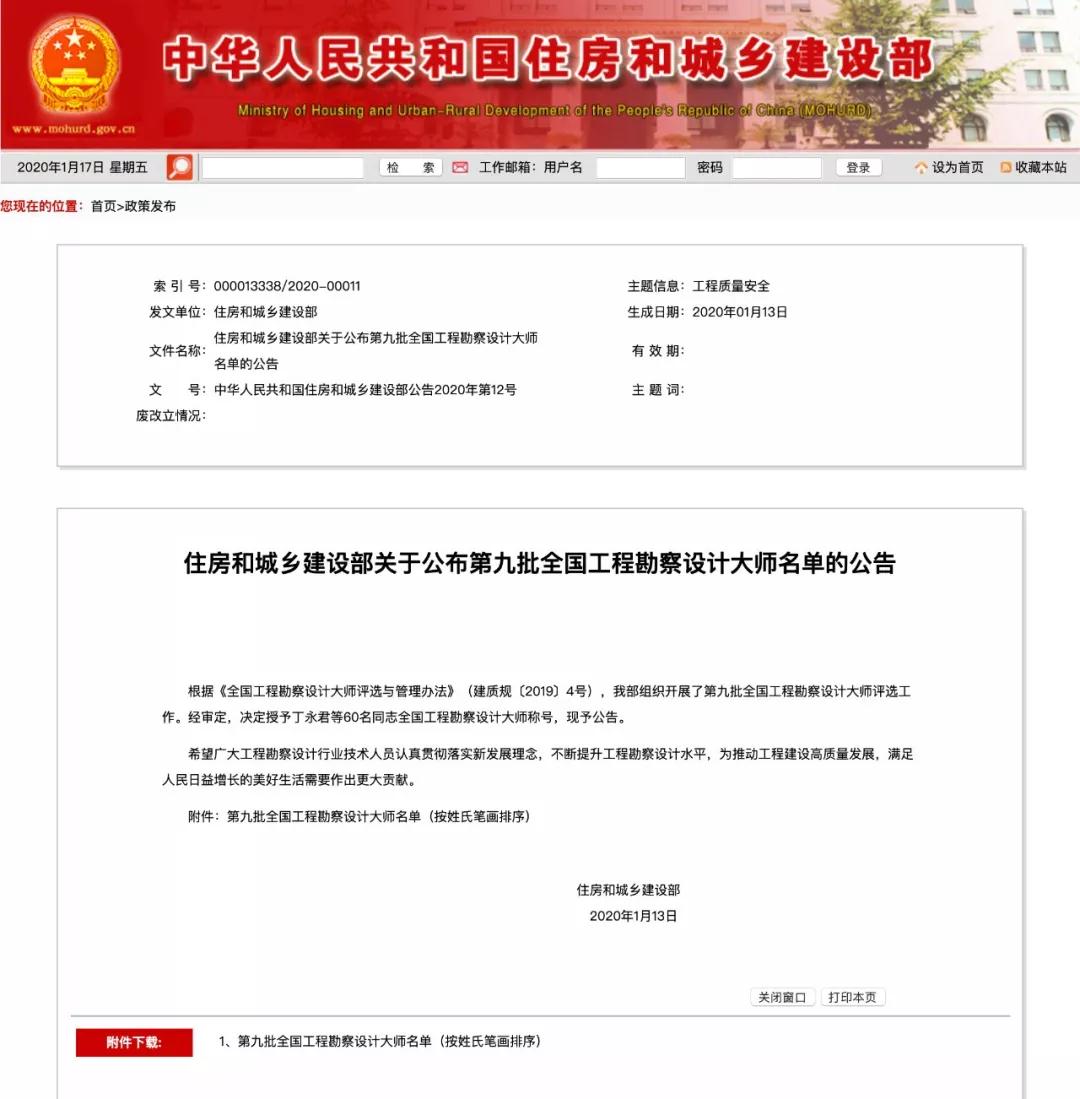 2020年1月,住房和城鄉建設部公布第九批全國工程勘察設計大師名單,共有60位同志被授予全國工程勘察設計大師稱號,其中建筑設計專業7位。中衡設計集團股份有限公司董事長、首席總建筑師馮正功榮獲全國工程勘察設計大師稱號。