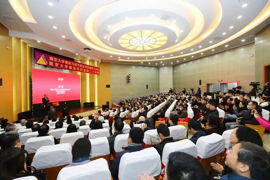 全國人大常委會委員、中科院院士、南京大學校長呂建,江蘇省住房和城鄉(xiāng)建設廳廳長周嵐,中國建筑學會副理事長趙琦, 江蘇省自然資源廳空間規(guī)劃局局長陳小卉,江蘇省土木建筑學會理事長繆昌文,中國城市規(guī)劃學會常務副理事長石楠,程泰寧院士,莊惟敏院士,王建國院士,任洪強院士等和百余名來自院校、學會、協(xié)會、設計院、規(guī)劃院等單位的嘉賓和師生代表薈萃一堂,回首過往,共謀未來。