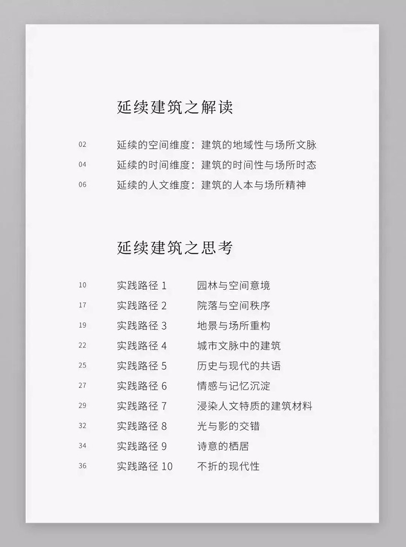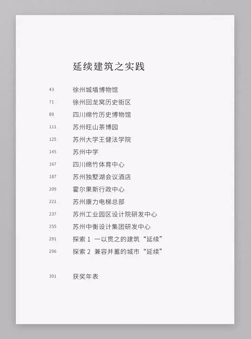 全書共分為三個部分:第一部分“延續建筑之解讀”,分別從空間、時間與人文三重維度詮釋何為“延續建筑”;第二部分“延續建筑之思考”提出了以該創作觀進行實際創作的十種實踐方法路徑;第三部分“延續建筑之實踐”是以延續建筑創作觀指導完成的十二項實踐案例,涵蓋博物館學校、體育中心、研發中心、酒店等不同項目類型。