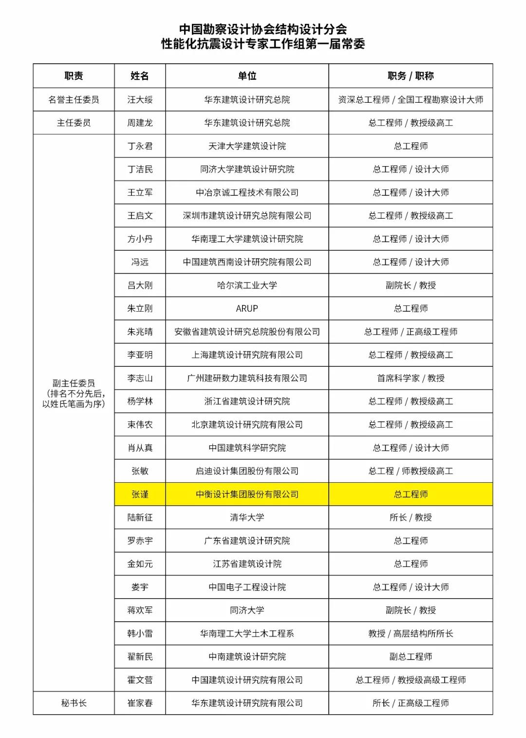 中國勘察設計協會結構設計分會性能化抗震設計專家工作組于2018年6月13日在上海成立,宗旨是通過對性能化抗震設計技術進行推廣、發展和促進,提高廣大結構設計人員對性能化抗震技術的認識和設計水平,增強工程應用的主動性和積極性,提高性能化抗震技術在重大工程建設中的積極作用,確保人民生命和財產安全。